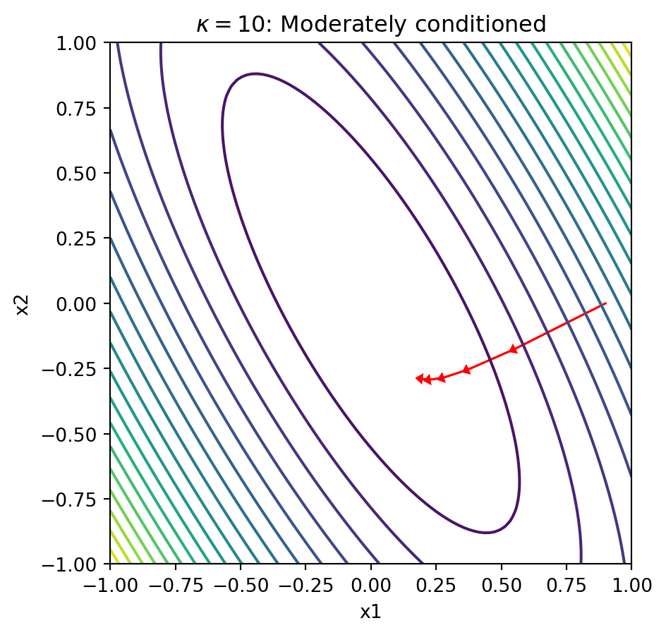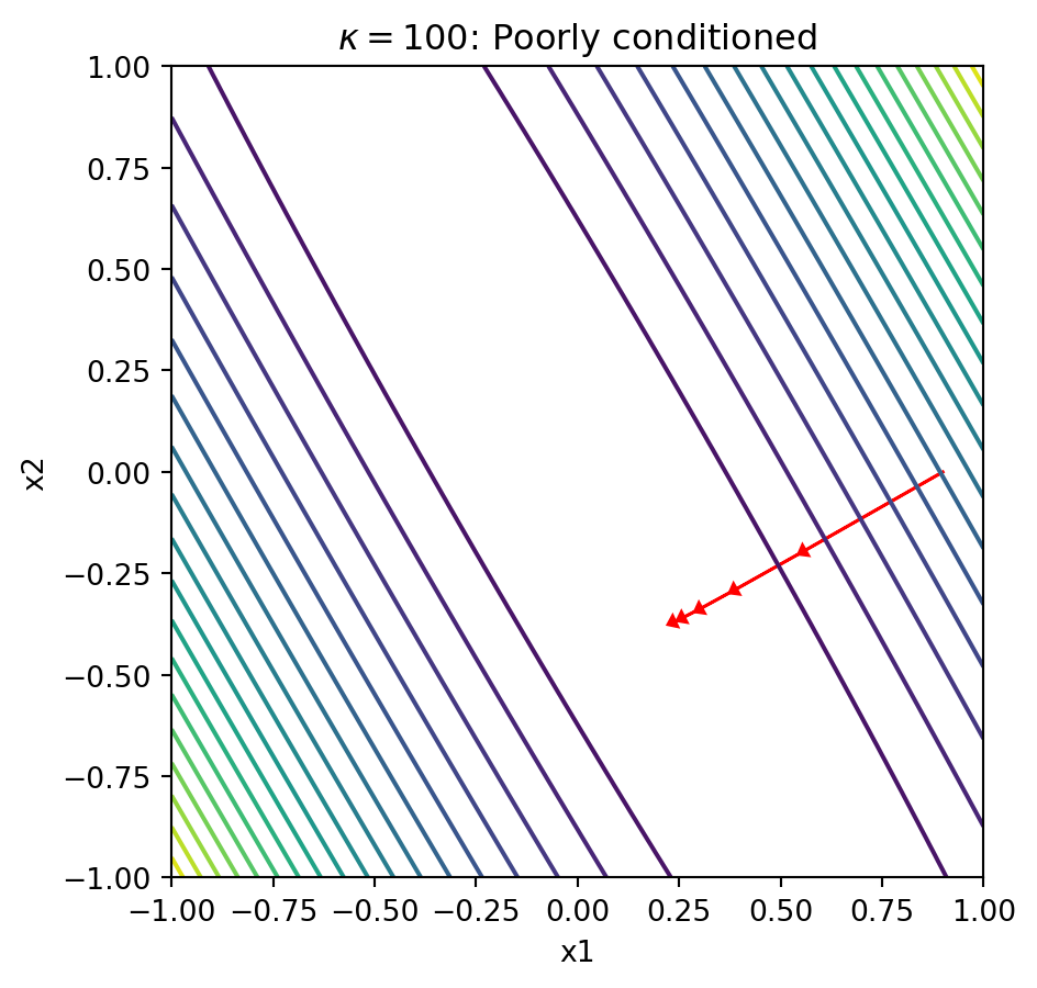 Explanation: When the condition number is large, the contours form narrow ellipses. The gradient points perpendicular to these contours, which means it points mostly in the “short” direction of the ellipse rather than toward the minimum. This causes gradient descent to zigzag slowly along the narrow valley, requiring many iterations to converge.