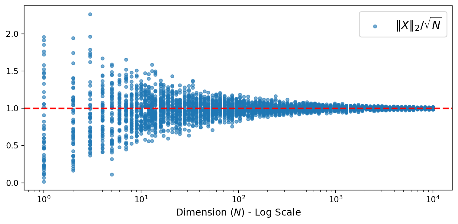 Dimension \(N\) appears nowhere! Randomness “averages out” across all \(N\) coordinates