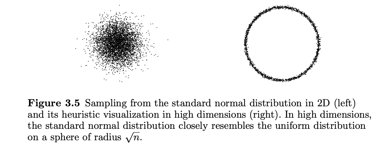 From Vershynin (2018): 2D Gaussian samples vs. random 2D projections of high-dimensional samples