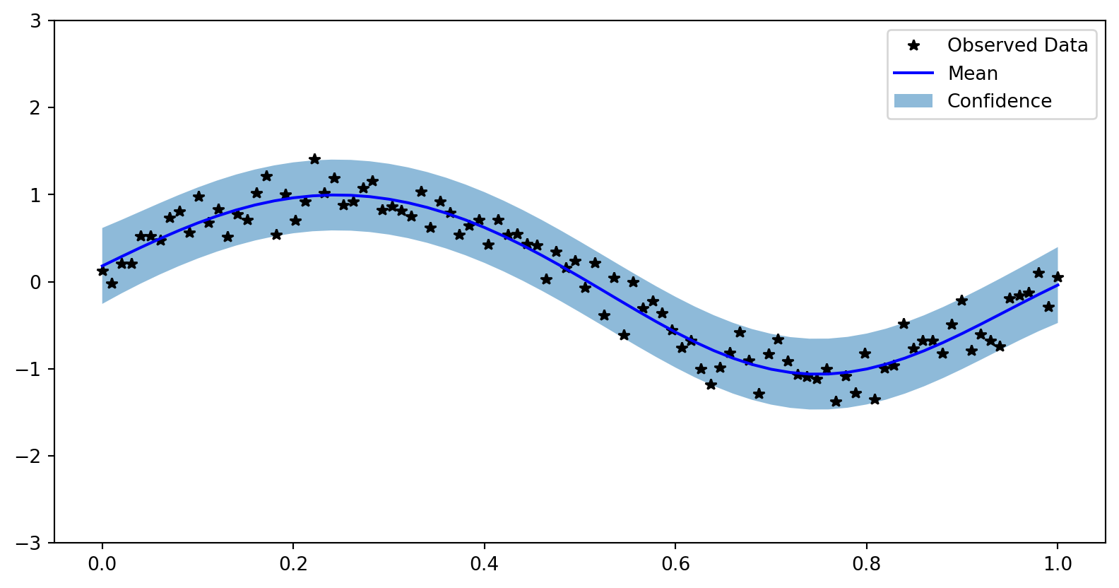 ax.legend(['Observed Data', 'Mean', 'Confidence'])
