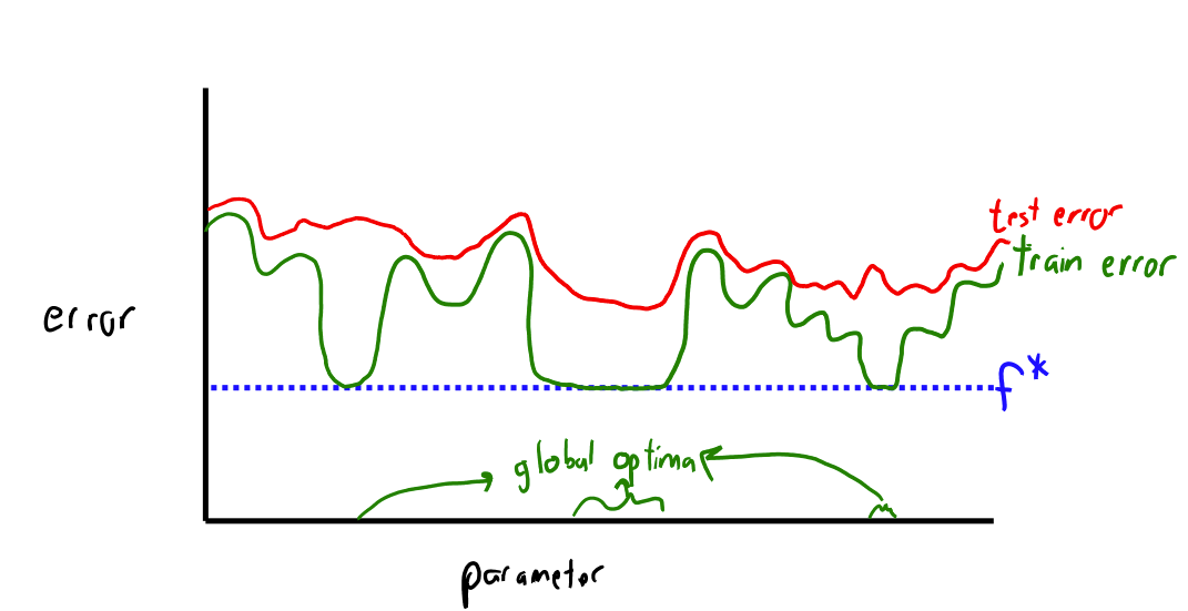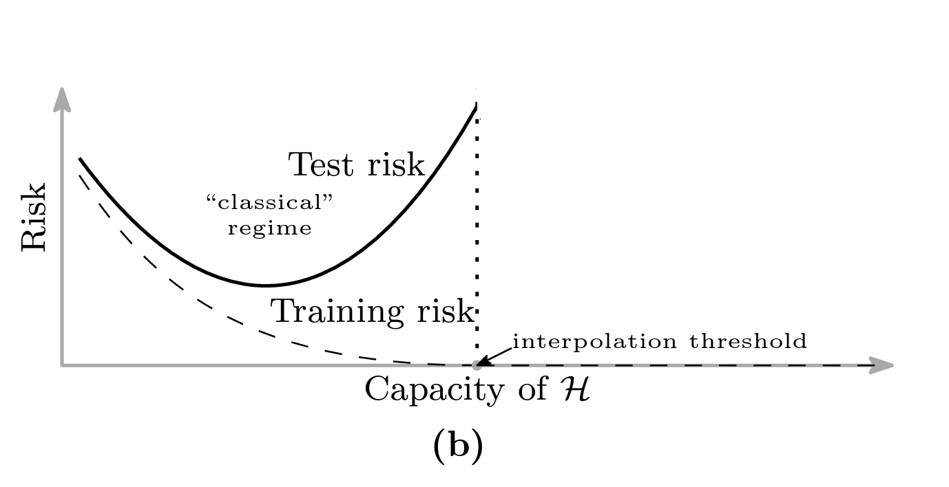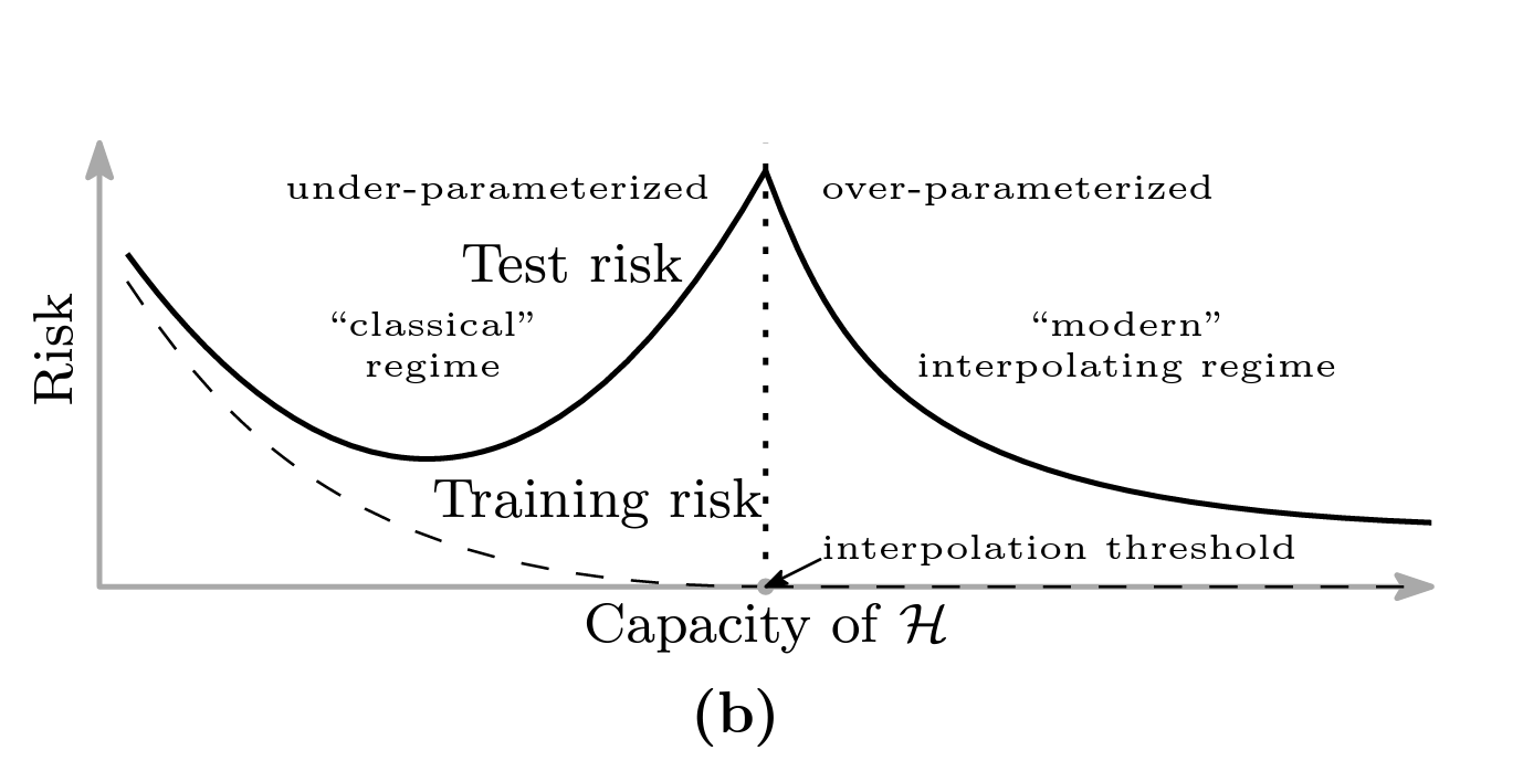 One interpretation is that ML optimization methods with sufficient parameters find a min-norm interpolating solution. Minimizing ERM: \[ \min_{f \in {\mathcal{H}}} \frac{1}{N}\sum_{n=1}^N \ell(f, x_n, y_n) \]