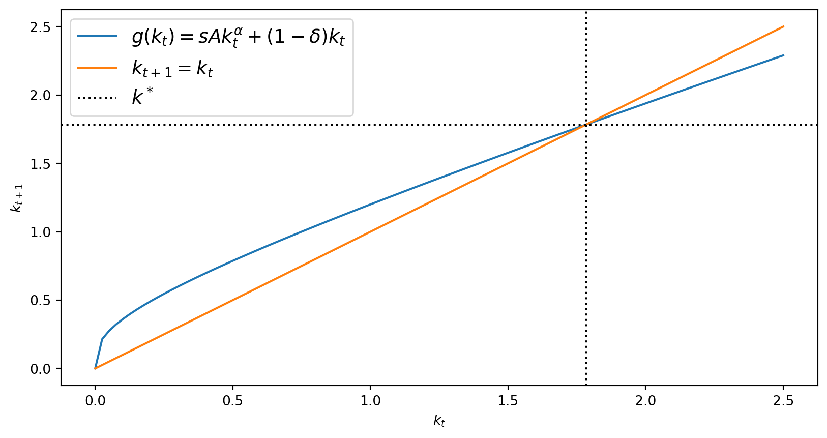 \[ \begin{aligned} y_t &= A k_t^{\alpha}\\ k_{t+1} &= s y_t + (1-\delta)k_t = s A k_t^{\alpha} + (1-\delta) k_t \equiv g(k_t)\quad \text{ given }k_0\\ k^* &\equiv \left(\frac{s A}{\delta}\right)^{\frac{1}{1-\alpha}} \end{aligned} \]
