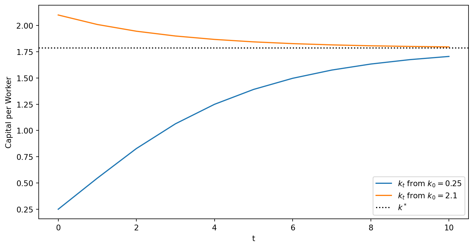 ax.set(xlabel="t", ylabel="Capital per Worker")