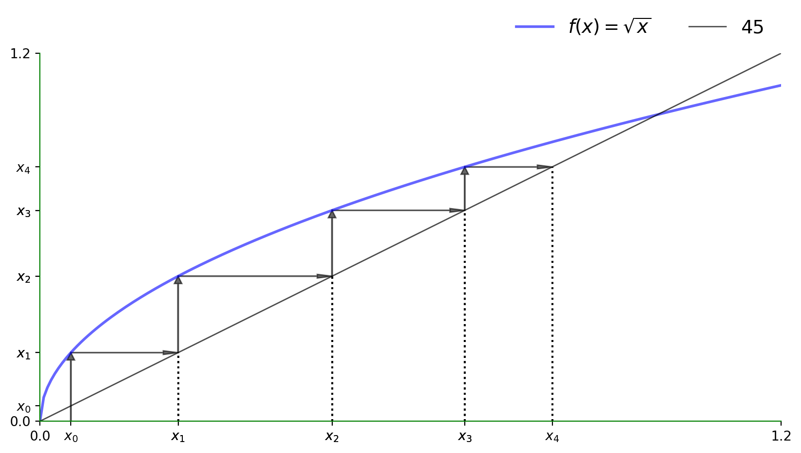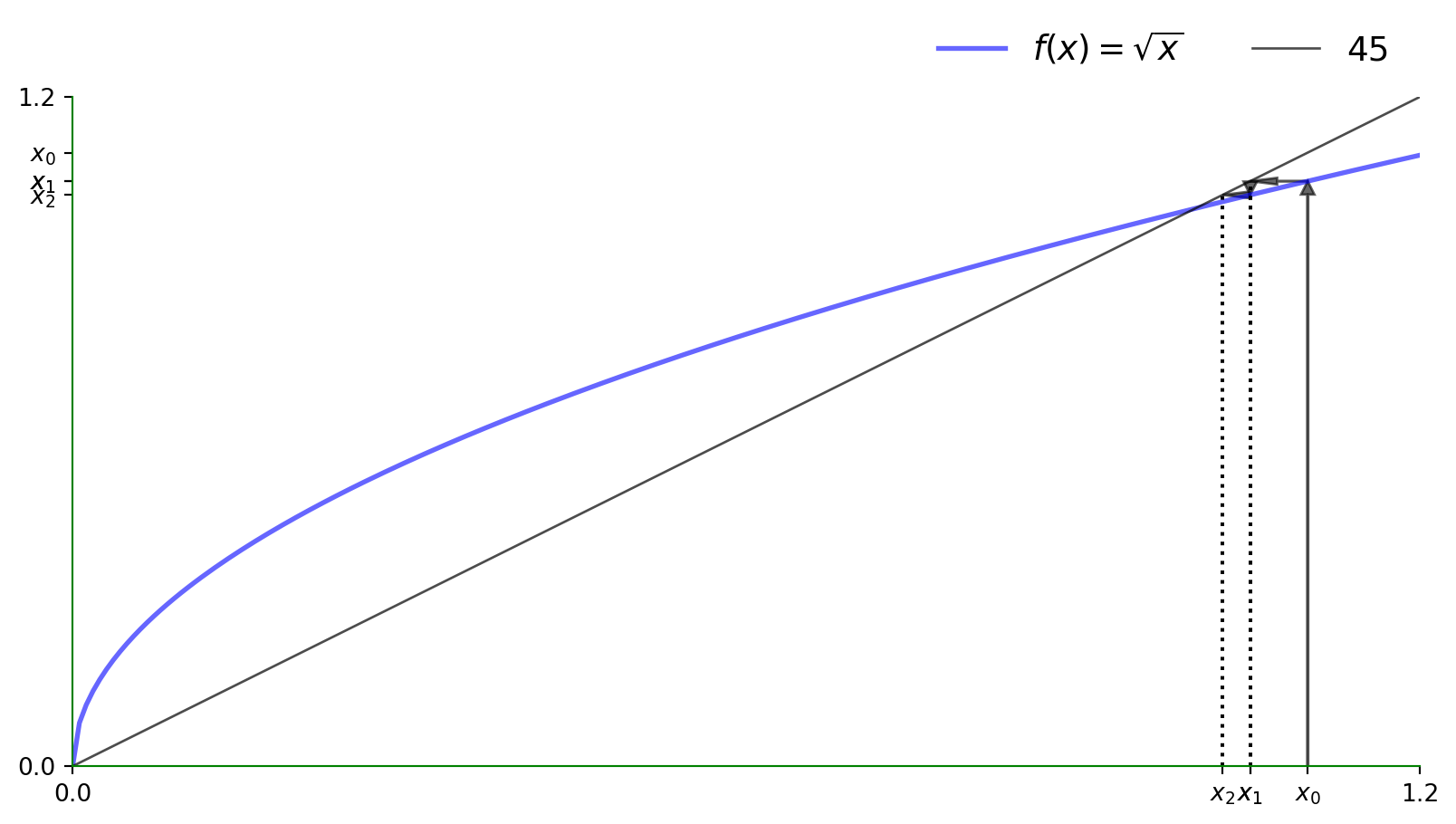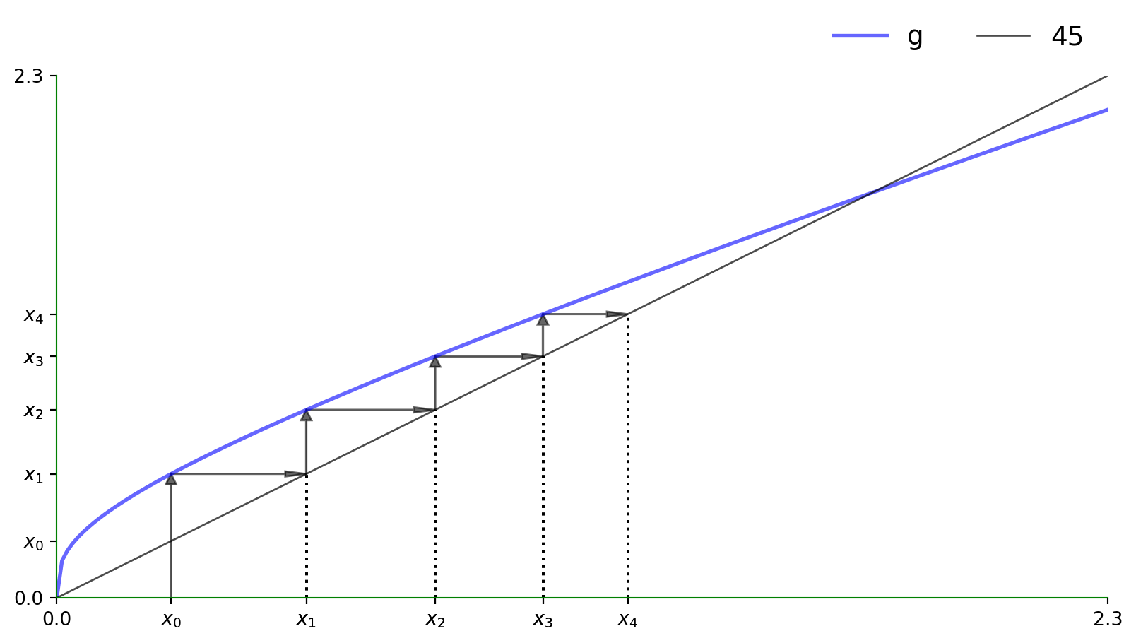 k_1 = g(k_0) = 0.546,k_2 = g(g(k_0)) = 0.828