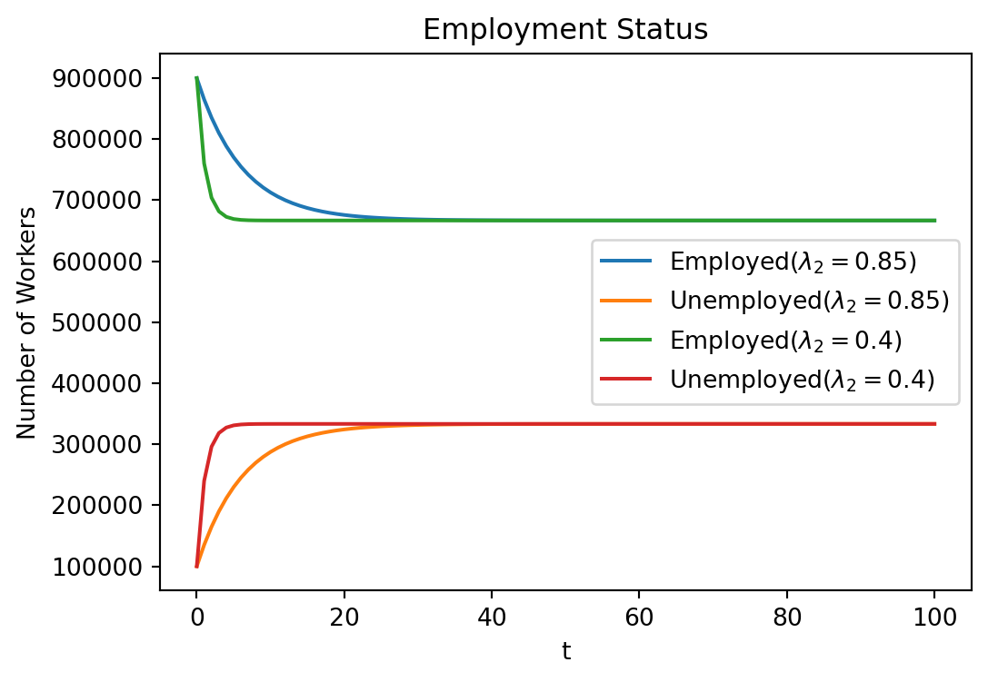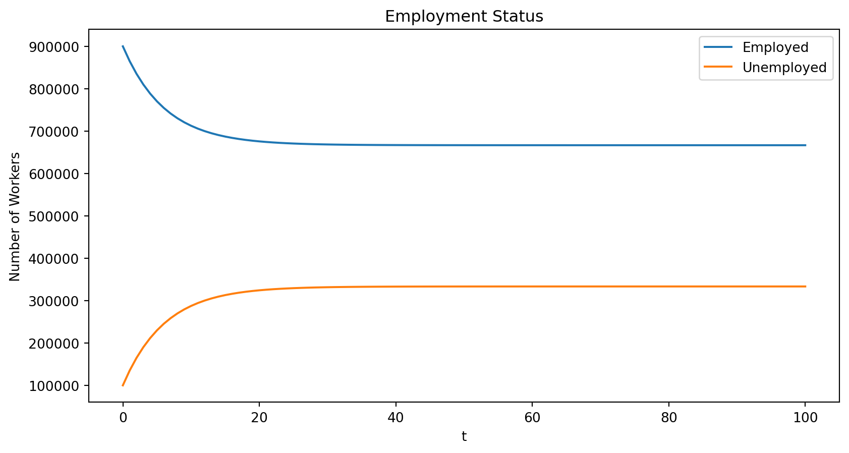 \[ \begin{aligned} E_{t+1} &= (1-\alpha) E_t + \phi U_t\\ U_{t+1} &= \alpha E_t + (1-\phi) U_t \end{aligned} \]