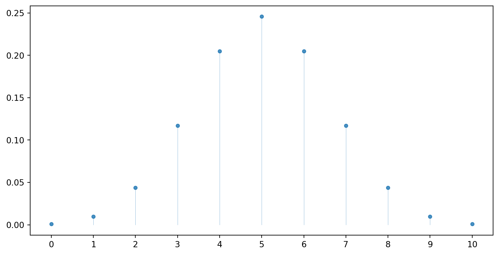 For \(n = 0, \ldots, N\), the binomial distribution is defined by the PMF