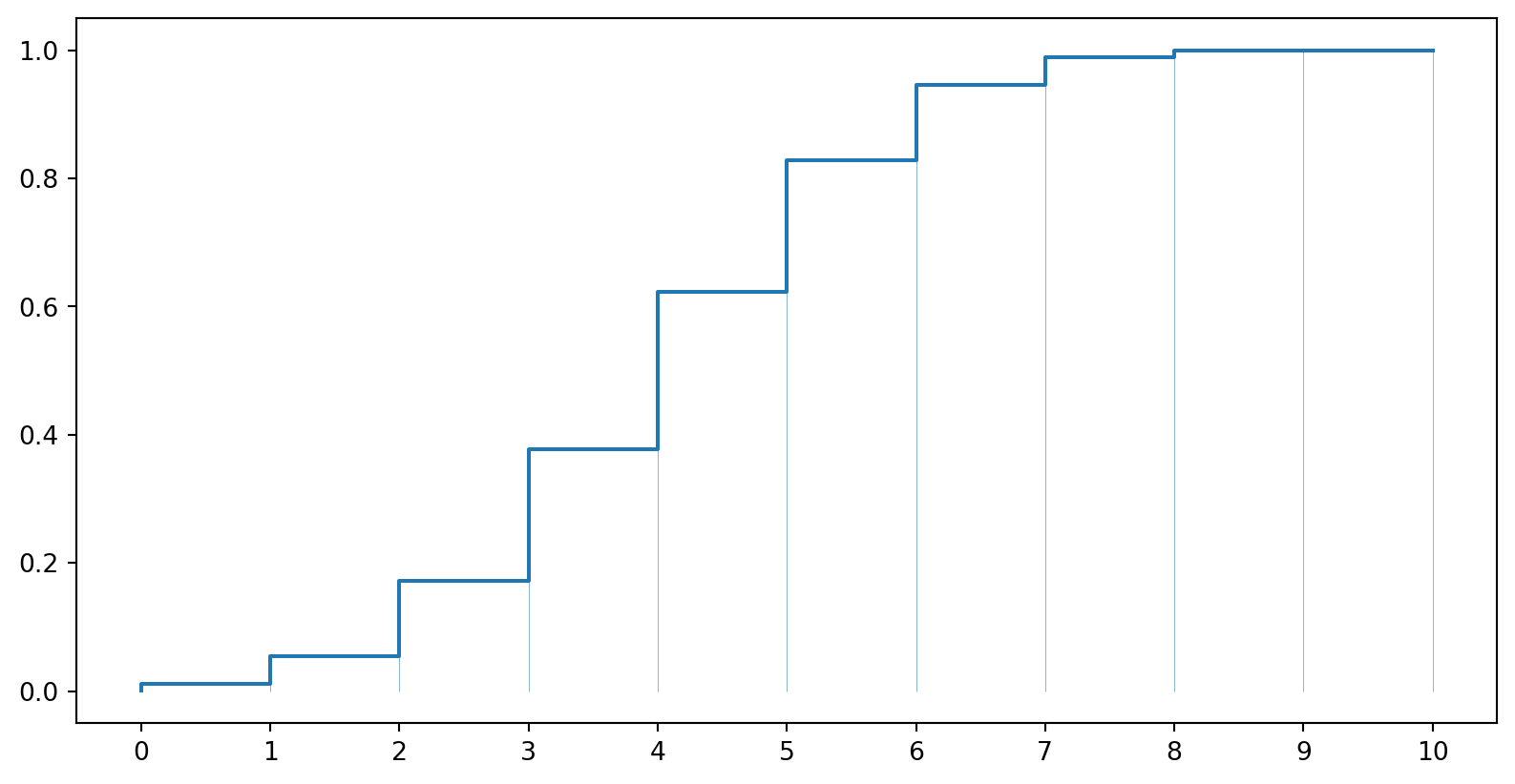 Cumulative Distribution Function (CDF) is the probability of all outcomes less than or equal to a particular outcome. \[ \mathbb{P}(X \leq n) = \sum\limits_{i=1}^{n} p_i \]