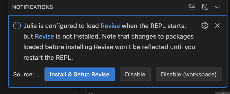 Install Revise? Your choice, but restart VS Code after installation: