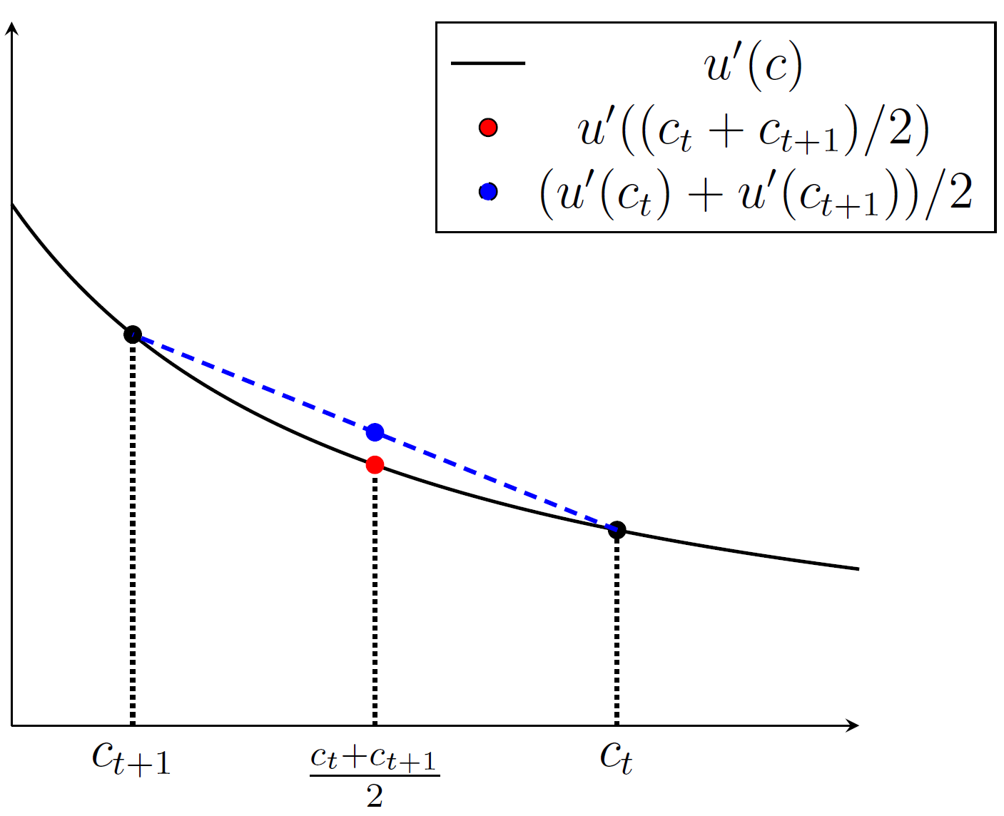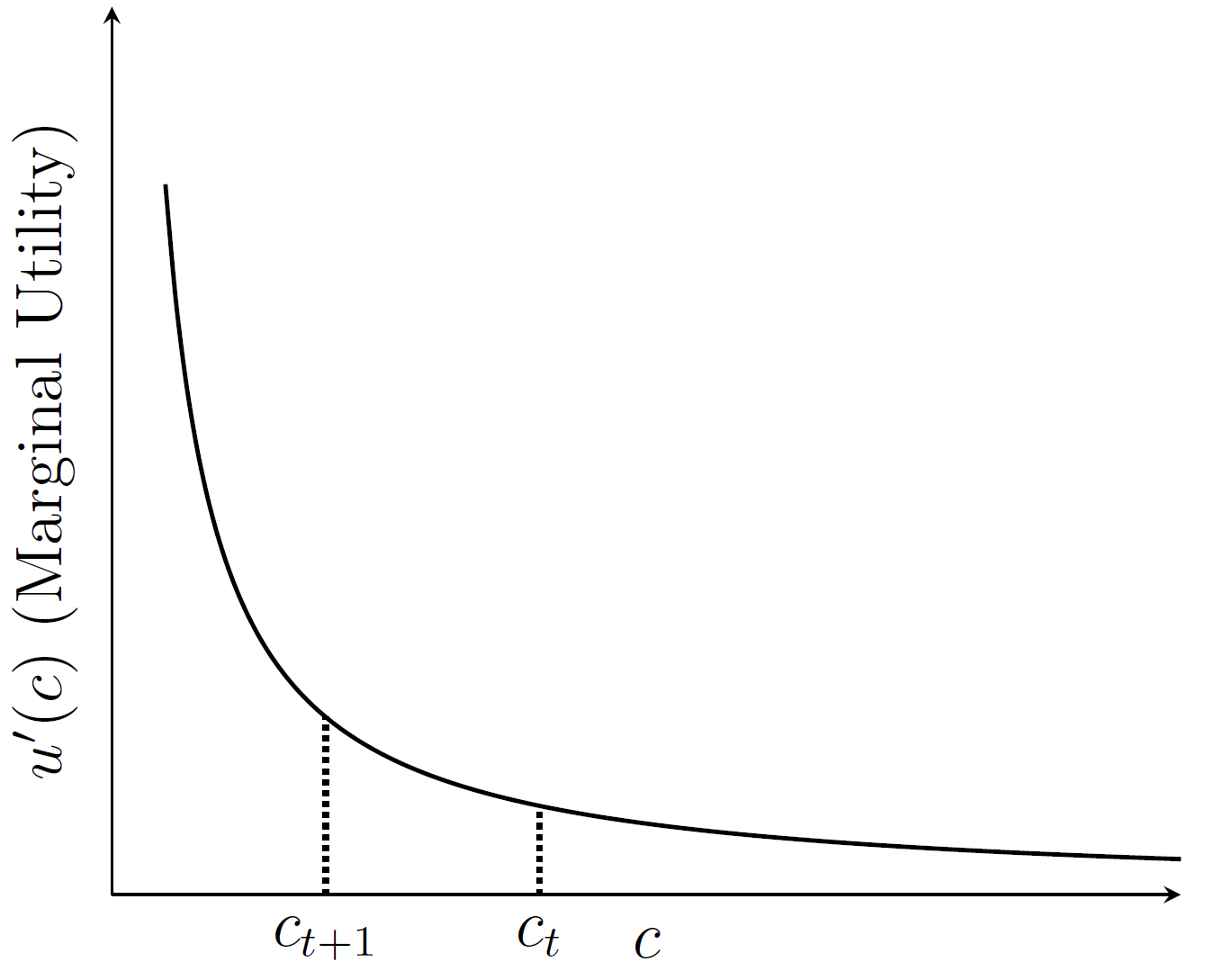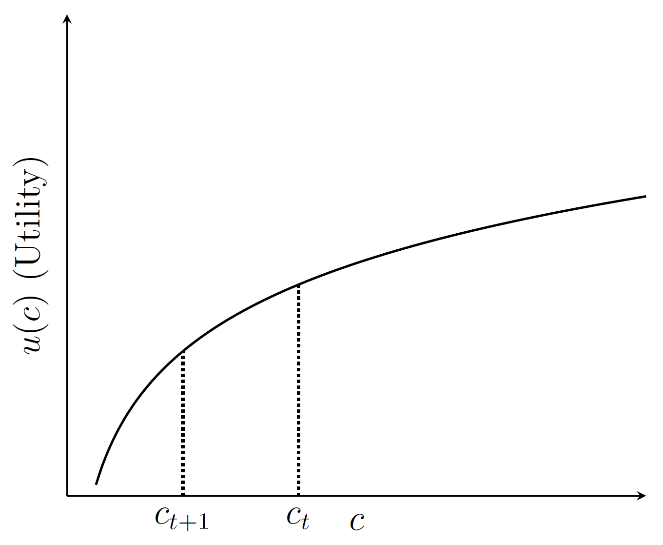 Moreover, given assumptions that \(u'(c) > 0\) and \(u''(c) < 0\), this implies that \(c_t = c_{t+1}\)