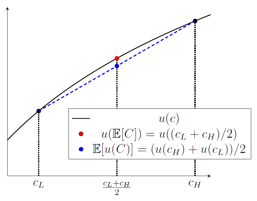 Note if risk-neutral then \(\mathbb{E}[C] = \frac{1}{2} c_L + \frac{1}{2}c_H = \bar{c} = u(\bar{c})\)