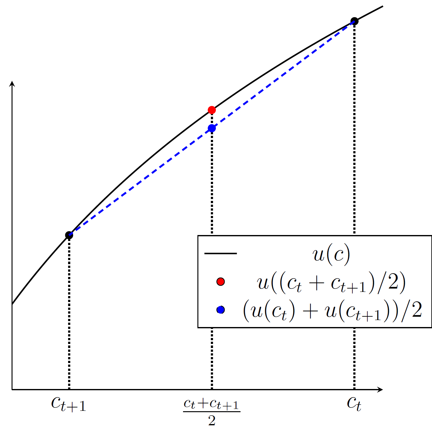 Then if an agent is risk-averse, \[ u(\mathbb{E}(C)) > \mathbb{E}[u(C)] \]