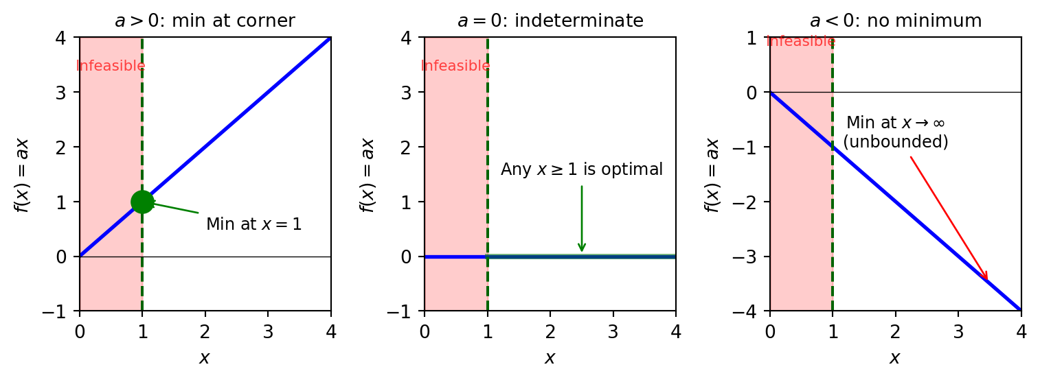 - \(a < 0\): min is at \(x = \infty\) (doesn’t exist, problem is unbounded)