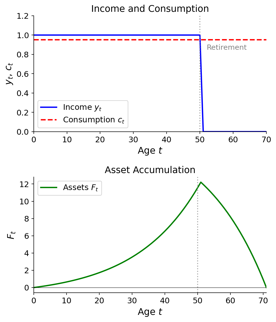 - Early life (borrowing phase): Income is below consumption, so \(y_t - c_t < 0\). The agent borrows (\(F_t < 0\)).