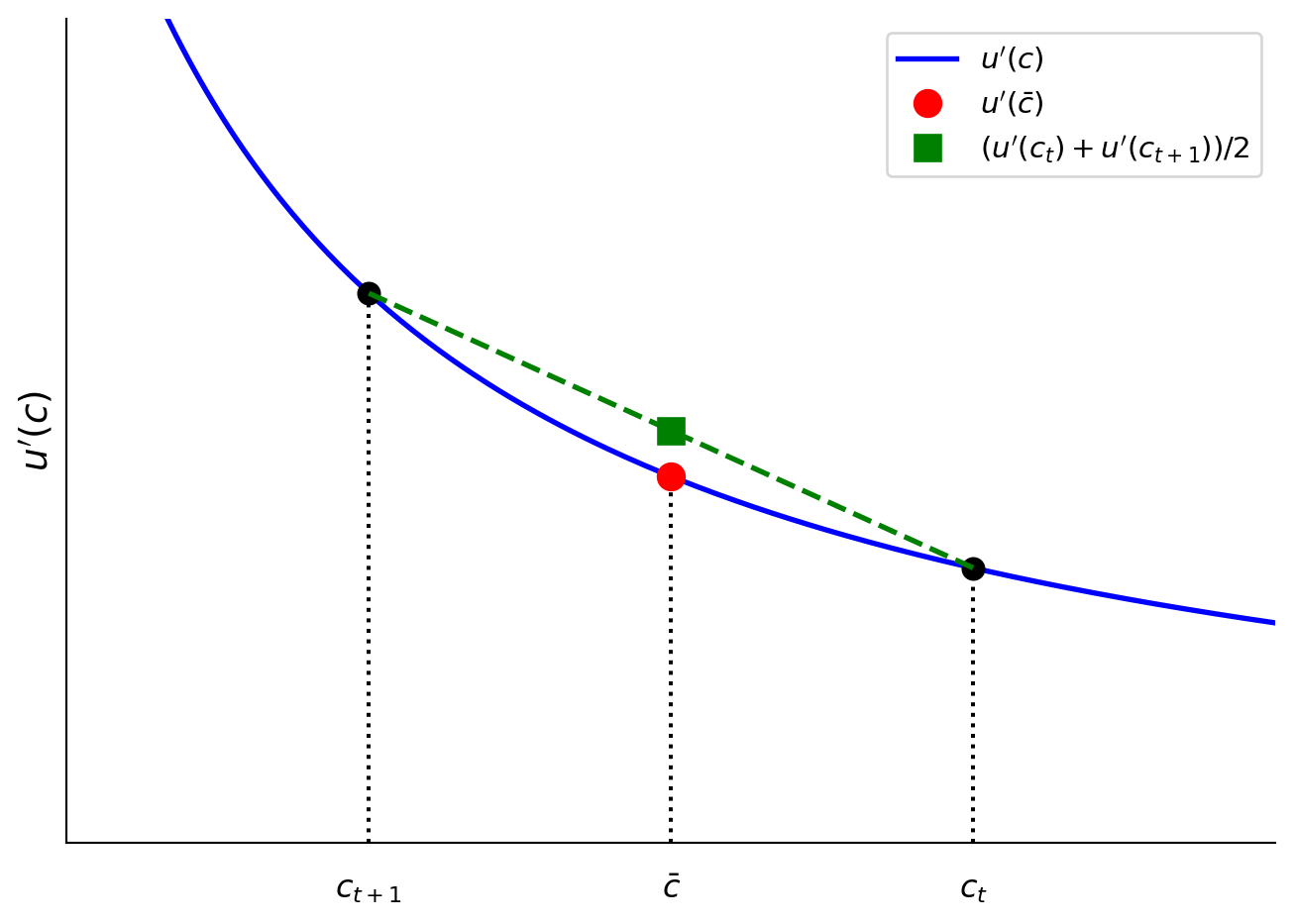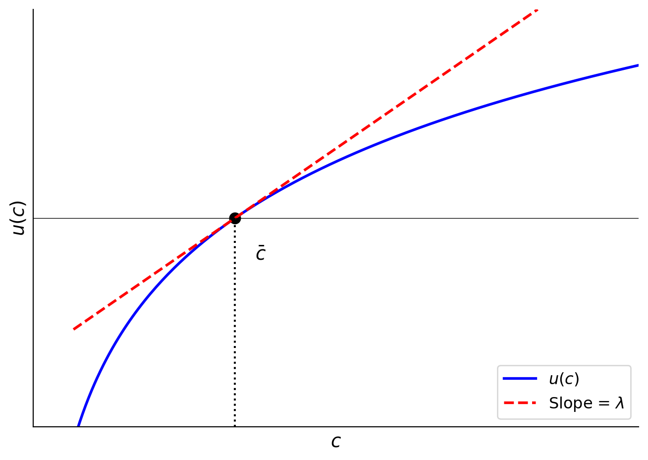 Example: If \(R = 1/\beta\), then \(u'(c_{t+j}) = \left(\frac{1}{\beta R}\right)^j \cdot \lambda = \lambda\) for all \(j\). The slope at \(c_{t+j}\) equals \(\lambda\), which means the marginal utility is constant. Therefore \(c_{t+j}\) is constant for all \(j\), giving us \(\bar{c} = c_{t+j} = u'^{-1}(\lambda)\).
