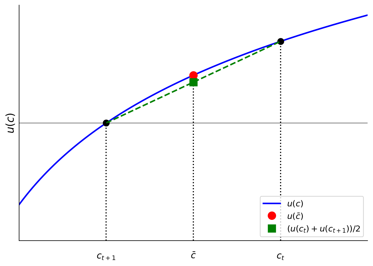 Figure 5 shows the simple case of \(\beta R = 1\) and two periods. If you take the average of the two periods’ consumption for both, it has a lower marginal utility of consumption—which corresponds to a higher utility as we see in Figure 6.
