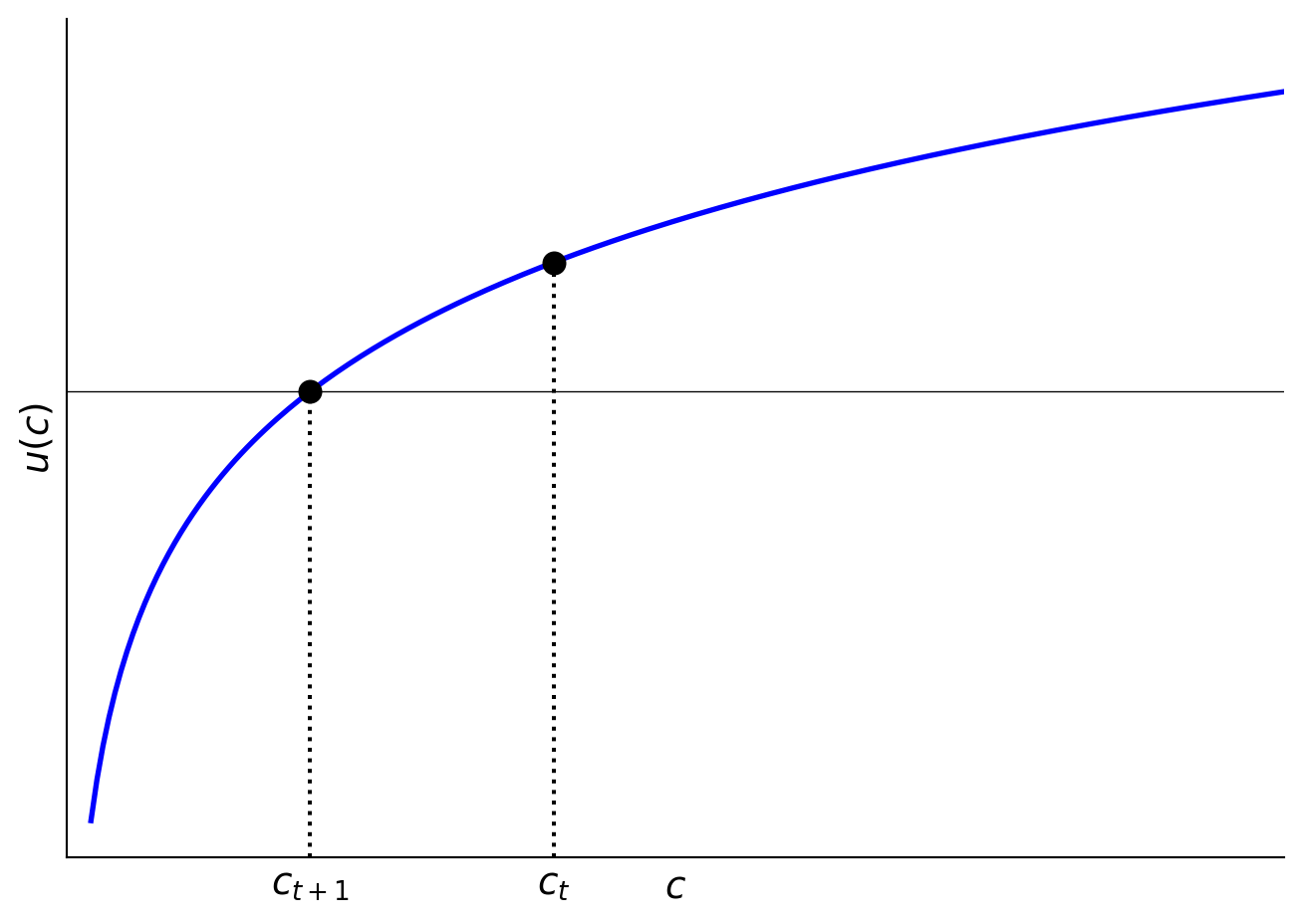 Figure 3 shows what it might be like to have the utility of consumption of two different \(c_t\) and \(c_{t+1}\). The corresponding Figure 4 shows the intertemporal tradeoff of lowering \(c_t\) to increase \(c_{t+1}\), which has higher marginal utility of consumption.